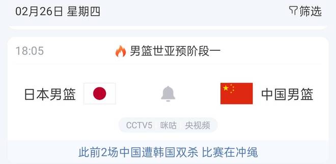 根据赛程安排,中国男篮将在北京时间2月26日晚上6:05对阵日本男篮,这场比赛CCTV5将进行直播,球迷可以按时观看。而在打完日本男篮后,中国队很快又将迎来下一个对手—中国台北男篮,打日本男篮,中国队必须要赢,打省队,我们更得赢,否则说不过去。从这次中国男篮的阵容来看,虽然不及亚洲杯时期,但依旧不俗,很多球员的选定都是按照状态来选的,比如说胡明轩就因为状态不行落选了。